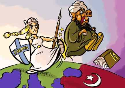 Kommt uns das bekannt vor? Islamisten, die außer sich geraten, wenn ihre Religion beleidigt wird, aber es vollkommen akzeptabel finden, im Namen der Religion zu morden? Die Islamisten von heute unterscheiden sich in nichts von den Islamisten damals! Das Abendland hat sich jedoch geändert. Im Abendland herrschen nicht mehr absolute, christliche Monarchen, sondern demokratisch gewählte Regierungen, die sich der Aufklärung verpflichtet haben. Dem Kalifat steht heute kein christliches Reich mehr gegenüber, sondern der Westen, ein multikultureller, aufgeklärter und demokratischer Komplex. {Anm.: Ha ha - wenn es nicht so traurig wäre, könnte Dikigoros über die beiden letzten Sätze nur müde lächeln.}