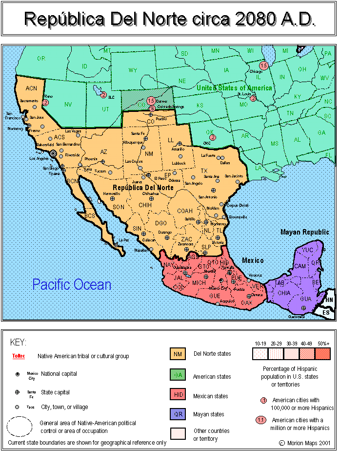 Er zählt zu denen, die jene Gebiete "Aztlan" nennen, nach dem legendären Herkunftsort der Azteken, und er und seine Gesinnungs-Genossen haben auch schon ziemlich genaue Vorstellungen, wie das in zwei bis drei Generationen aussehen soll mit der mexikanischen Wiedervereinigung: "Die unproduktiven Ostgebiete, Yucatán, Chiapas und Tabasco (das ist da, wo der Pfeffer wächst, Anm. Dikigoros), das ist wie bei Ihnen mit Ostpreußen, Hinterpommern und Schlesien, die brauchen wir nicht, da sitzen eh nur Mayas, die entlassen wir in die Unabhängigkeit, dann sollen sie sich mit Belize und Guatemala zusammen tun und sehen, ob und wie sie vom Tourismus leben können. Dann der Mittelteil, das ist wie Ihre DDR, den trennen wir auch ab, mit dem gehen wir eine lockere Föderation ein, als Arbeitskräfte-Reservoir für Billiglohnjobs im Norden, aber ohne Wirtschafts- und Währungs-Union, das wäre ein Faß ohne Boden, wie bei Ihnen. Und die guten, produktiven Gebiete im Westen und Norden fassen wir zusammen zu einer República del Norte, das wird ein Wirtschaftswunderland, da werden blühende Landschaften entstehen. Und..." - mit einem Augenzwinkern - "wir werden einen gaaanz hohen [muuuy alto] Grenzzaun bauen, damit uns die Gringos nicht ihre Neger 'rüber schicken; die haben sie vor 500 Jahren selber ins Land geholt, nun sollen sie sich auch selber mit ihnen herum schlagen; und die aus Kalifornien und den anderen Staaten werfen wir hinaus, das sind Illegale, die auf altem amerikanischen Gebiet nichts verloren haben."