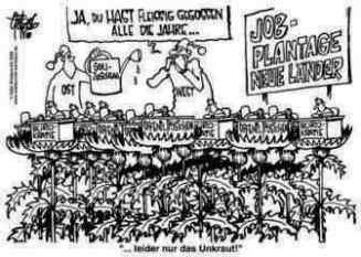 Dikigoros muß an die Karikatur denken, die gerade irgendwo erschienen ist: Der Bundesadler als Huhn, das schöne große goldene Eier legt, die der westdeutsche Michel dem Ossi großzügig 'rüber trägt; und der blöde Ossi-Gartenzwerg mit roter Zipfelmütze weiß damit nichts besseres anzufangen, als sie gleich zu zerschlagen und als Spiegeleier zu verfrühstücken... Gewiß, solche Fälle hat es gegeben, sogar reichlich; aber einige Leute im Westen versuchen auch, mit dieser pauschalen Schuldzuweisung von ihren eigenen Fehlern bei der "Wieder"-Vereinigung abzulenken, und das empfindet Dikigoros als Vergackeierung. Er weiß es besser, denn er hat mal für einen Industrieverband gearbeitet, dessen Mitgliedsfirmen hauptsächlich davon lebten (und gut lebten), daß sie High-Tech-Produkte an den CoCom-Kontrollen vorbei in den Ostblock exportierten, im Austausch gegen billige Rohstoffe und Einfach-Produkte wie Textilien. Mit dem Fall der Mauer sind all diese Märkte auf einen Schlag weg gebrochen. Kurzsichtige Politiker, von der Lobby der Exporteure massiv unter Druck gesetzt (und, wie später heraus kommen wird, auch großzügig "geschmiert" - freilich werden sie nie wegen Bestechlichkeit oder Vorteilsannahme verurteilt, denn es gibt in der BRD kein Gesetz, daß es Parlamentariern verböte, sich schmieren zu lassen), haben versucht, als Ersatz dafür das Absatzgebiet "Neue Bundesländer" zu schaffen, und die Voraussetzungen dafür künstlich und auf volkswirtschaftlich ungesunde Art und Weise hergestellt: Zunächst einmal mußte die Billiglohn-Konkurrenz kaputt gemacht werden, denn wenn die DDR-Mark zu einem realistischen Kurs in DM umgetauscht worden wäre - etwa 4:1 oder 5:1 - und die Löhne und Gehälter (und Renten) nicht überstürzt auf West-Niveau angehoben worden wären, dann wäre die Ex-DDR sehr schnell Export-Weltmeister geworden, weil sie die teure westdeutsche Konkurrenz auf den Weltmärkten - die ihr ja nun offen standen - mit ihren niedrigen Produktionskosten spielend unterboten hätte. Das durfte nicht sein, also führte man die Währungs-Umstellung de facto 1:1 durch, um Kaufkraft zu schaffen für die teuren West-Produkte.