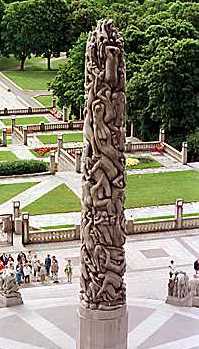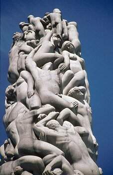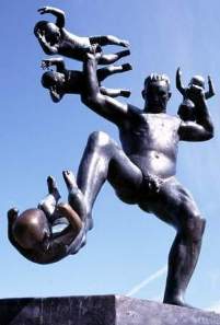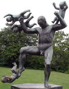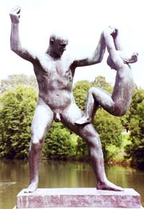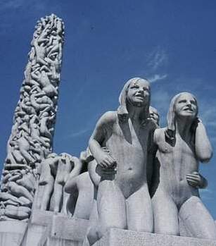 Aber wenn Ihr nun glaubt, liebe Leser, mit der Abschaffung des olympischen "Kunst"-Wettbewerbs nach 1948 würden nur noch künstlerisch wertvolle Klein-Plastiken wie die Nurmis außer Konkurrenz auftauchen, dann irrt Ihr. Noch bei den Winterspielen 1952 in Oslo wurden Skulpturen eines gewissen Gustav Vigeland aufgestellt, die man nur als [Kinder-]Pornografie bezeichnen kann (aber sie stehen bis heute!), z.B. ein nackter Mann mit gespreizten Beinen, an dessen ausgestrecktem linken Arm ein kleines nacktes Mädchen hängt, das mit angezogenen Knien auf sein bestes Stück zu schaukelt, oder ein nackter Mann, der vier nackte Knäblein schlägt und tritt. Und über alledem thront - gewissermaßen als Gipfel des schlechten Geschmacks - eine pseudo-indische Stele aus in einander verschlungenen Nackten.
