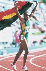 Nur eine Goldmedaille läßt man sie nicht gewinnen: die über 400 m. Warum nicht? Nun, das soll eine politisch-korrekte Demonstration werden, für die Toleranz der Australier gegenüber ihren "Eingeborenen": Bereits das olympische Feuer hat man die Australnegerin Cathy Freeman entzünden lassen, und für sie ist auch die Goldmedaille auf der Königsstrecke reserviert. Damit die Zuschauer sie auch erkennen unter den vielen anderen Negerinnen, darf sie als einzige in einer Art Pseudo-Taucheranzug starten, von Kopf bis Fuß verhüllt, und mit 2 m Vorsprung ins Ziel laufen. Anschließend zieht sie den Taucheranzug aus und schwenkt - obwohl das eigentlich unzulässig ist - die schwarz-rot-goldene Flagge der Australneger, die für eine Organisation steht, deren Fernziel die Machtergreifung in Australien ist, damit das genauso endet wie Süd- und Südwestafrika, Rhodesien und all die anderen Staaten, in denen die Eingeborenen erst die Regierung übernommen und dann die Weißen ermordet oder vertrieben haben. Niemand denkt daran, sie etwa zu disqualifizieren wie einst die US-Neger, die für "Black Power" demonstrierten - ganz im Gegenteil: die tumpen Weißen jubeln ihr zu, auch als sie lautstart erklärt, daß sie sich nicht als Australierin, sondern ganz als "Aboriginee" fühlt und stolz darauf sei. Ob sie dazu Grund hat? Aber gewiß doch: Ihr Vater - Australneger und Alkoholiker, die wie meisten seiner Art - hat Frau und Kinder verlassen, als Cathy gerade 5 Jahre alt war; und ihre Mutter hat einen DummenWeißen gefunden, der sie geheiratet und sich um die Kinder gekümmert hat; ihm verdankt Cathy alles, auch ihre sportliche Karriere. Aber Undank ist der Welt Lohn, liebe Leser, schreibt Euch das hinter die Ohren und denkt daran, wenn Ihr wieder ein paar Millionen "Flüchtlinge" aus Afrika und dem Rest der "Dritten Welt" in Europa aufnehmt!