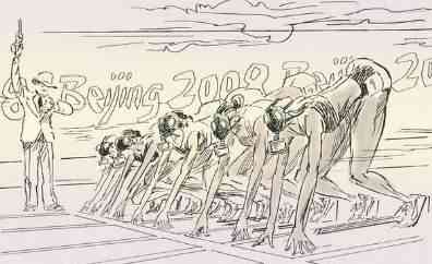 Irgendwie schafft man es, wenigstens im Schwimmen ein paar neue Rekorde aufzustellen - und seien es australische, damit wenigstens das einheimische Publikum das Interesse nicht ganz verliert -; aber die übrigen Leistungen brechen auf breiter Front ein - niemand will mehr riskieren, durch auffallende Zeiten oder Weiten beim tumpen Publikum in den Verdacht des Dopings zu geraten. (Wahrscheinlich hält deshalb auch der Speerwerfer auf der 5-Dollar-Münze links oben den Speer verkehrt herum, mit dem Daumen nach vorne :-) Irgendwelche verlogenen Statistiken (aber das ist ja schon fast doppelt gemoppelt) "beweisen" hinterher dennoch, daß dies "die erfolgreichsten Spiele aller Zeiten" waren, mit den meisten Zuschauern aller Zeiten - man hat einfach die Zahl aller Fernsehgeräte auf der Welt genommen und kühn unterstellt, daß jeder Neger im Busch, jeder Eskimo am Pol und jeder Bierbauch in Mitteleuropa irgendwann mal "zugeschaut" hat - und sei es nur, weil er aus Versehen kurz rein gezappt ist (schließlich läuft der Mist auf fast allen Kanälen fast rund um die Uhr) und gleich weiter geschaltet hat.