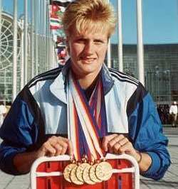 In der Leichtathletik werden die Skandale - mit einer Ausnahme - etwas besser vertuscht; und es ist vielleicht kein Zufall, daß sich an die "Helden" von Seoul heute kaum noch jemand erinnert, obwohl das doch noch gar nicht so lange her ist - es dürfte dies eher eine Frage der Verdrängung als des Vergessens sein. Doch, eine Fratze wird uns ja jeden Abend von den ZDF-Sportnachrichten in Erinnerung gerufen: die der Ossinesin Kristin Otto, der best-gedopten und erfolgreichsten Schwimmerin aller Olympiaden und aller Zeiten. Sechs Gold-Medaillen gewinnt sie in Seoul. Es ist der Schwanen-Gesang des maroden DDR-Regimes, das so pleite ist, daß es zur Gewinnung von Devisen nun sogar einige seiner Sportler[innen] in den kapitalistischen Westen ausreisen läßt, um dort Geld zu verdienen. Natürlich nur absolut verläßliche und linientreue Kader, wie "Honis Liebling", die SED-Genossin, Stasi-Mitarbeiterin und Volkskammer-Abgeordnete Katarina Witt (eine Eisläuferin, die Zeit ihres Lebens nie einen dreifachen Sprung gestanden hat, aber infolge geschickter Absprachen zwischen den Punktrichtern nie ohne Medaille blieb). Rückblickend hat die DDR nur im Fälschen von Wirtschafts-Statistiken und Dopen von Sportlern "Welt-Niveau" erreicht. Nein, ihre Sportler[innen] sind nicht die meist-, aber die best-gedopten, so gut, daß Kristin Otto noch Jahre später behaupten kann, sie habe gar nichts davon gemerkt und auch nie Nebenwirkungen verspürt...