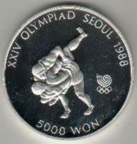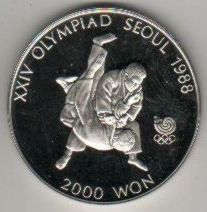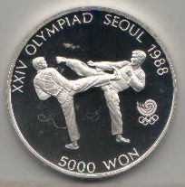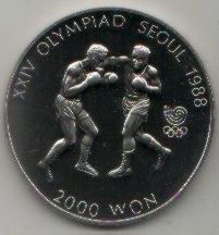 1988 findet die XXIV. Olympiade in Seoul statt. Warum, weiß der Geier, denn es paßt weder in die amerikanischen noch in die europäischen Top-Sendezeiten, und schließlich werden die Spiele inzwischen überwiegend aus den Übertragungsrechten und der Fernseh-Werbung finanziert. (Nicht umsonst zeigt das Plakat einen stilisierten Fernsehturm, der in alle Welt ausstrahlt, vor dem sich der Athlet mit seiner olympischen Tran-Funzel ziemlich mickrig ausnimmt. Und auch die Friedenstaube auf der Medaillen-Rückseite wirkt nicht umsonst so auffallend hohl - ein treffendes Sinnbild!) Aber sie sollten halt mal wieder nach in Asien vergeben werden, und dort nicht schon wieder nach Japan - warum also nicht an seine einstige Kolonie Korea? (Wohin sonst? Das marode kommunistische Regime Rot-Chinas scheut den zersetzenden Einfluß ausländischer, besonders westlicher Zuschauermassen auf die eigene Bevölkerung wie der Teufel das Weihwasser - deshalb darf auch Taiwan nicht ran; die Kanaken-Staaten Filipinen, Malaysia und Indonesien sind organisatorisch nicht in der Lage, eine solche Großveranstaltung zu stemmen; und Indien hat sich als Ausrichter der Asien-Spiele von 1982 derart blamiert, daß es für die nächsten Jahrzehnte als Veranstaltungsort völlig diskreditiert ist.) Der Ärger ist nur, daß Korea noch immer zweigeteilt ist, in einen kommunistischen Norden (wo eine Hungersnot die andere jagt) und einen kapitalistischen Süden (wo es wirtschaftlich scheinbar steil bergauf geht und noch niemand an den Asien-Crash denkt, der die Gipfelstürmer in weniger als einem Jahrzehnt sehr unsanft auf den Boden der Tatsachen zurück werfen wird). Die UdSSR (deren Regime politisch und wirtschaftlich ebenfalls in den letzten Zügen liegt - eine olympische "Agonie" kommt da also gerade recht) und die USA wollen diesmal beide teilnehmen (man hat sich bereits 1986 auf einer Art Zwischen-Olympiade in Moskau, an der wieder alle teilgenommen haben, halbwegs ausgesöhnt); aber Cuba - wo noch immer der alternde Kommunist Fidel Castro herrscht und mit ihm Not und Elend - erklärt sich mit Nordkorea "solidarisch" und sagt ab. (Wahrscheinlich konnte er bloß nicht die Valuta für die Reisekosten aufbringen, denn die Sowjets, bei denen wie gesagt auch Ebbe in der Kasse war, bezahlten ihm seine Zuckerrohr-Lieferungen inzwischen nicht mehr in harten Devisen, und andere Einnahme-Quellen hatte er noch nicht - der Valuta-Tourismus war noch nicht angelaufen.)