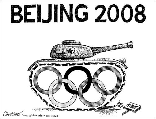 Nachtrag. Dikigoros hat Anfragen seiner Leser erhalten, warum er ihnen die Fortsetzung dieser vielleicht nicht schönen, aber doch recht interessanten Geschichte vorenthält und seine Berichterstattung über die Olympischen Spiele an dieser Stelle abbricht. Weil die Chinesen Krieg gegen die Tibeter führen, wie es die Karikatur oben andeutet (die Dikigoros übrigens schon seit 2004 hier stehen hat!)? Ach was, es gab ja auch früher Kriege während der Todesspiele; und in Tibet herrscht doch zur Zeit sogar FriedhofsruheFriede! Weil sie den Völkermord der Sudanesen in Darfur unterstützen? (Mit dieser Begründung hat der jüdische Regisseur Spielberg, der die olympische Eröffnungsfeier inszenieren sollte, ihnen den Kram hingeworfen.) Ach was, das bekämen die Sudanesen auch ohne chinesische Waffenlieferungen hin, notfalls mit Pfeil und Bogen!