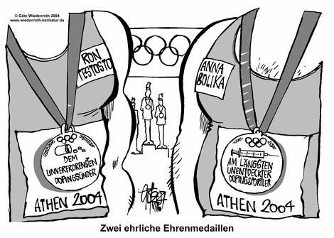 Die Ereignisse im Vorfeld der Winterolympiade 2006 in Turin bestätigen Dikigoros voll und ganz: Die italienische Regierung - pfui, der böse, faschistoide Berlusconi! - hat ein Gesetz eingebracht (und das Parlament hat es doch tatsächlich verabschiedet!), wonach Doping - Einnahme ebenso wie Verabreichung - künftig eine Straftat ist, die mit Gefängnis geahndet werden kann. Die USA drohen daraufhin mit Boykott - schließlich sind alle ihre Sportler gedopt; und sie wollen nicht riskieren, daß Italien sie erpreßt und sich etwa nicht an die Medaillen-Absprachen hält, sondern statt dessen einseitig nicht-italienische Sportler, Trainer oder Ärzte einbuchtet. Da haben die Amis mal recht; und so einigt man sich intern darauf, während der Spiele überhaupt keine Doping-Proben zu veröffentlichen. Und als zwei Jahre später der ungarische Kanufahrer Györgi Kolonics - Medaillengewinner 1996 und 2000 und immerhin 15-facher Weltmeister a.D. - es in leicht fortgeschrittenem Alter noch einmal wissen will und mit allen Mitteln und Mittelchen darauf hin arbeitet... Um es kurz zu machen, er fällt beim Training tot um, und alle Trainer und Funktionäre vergießen reichlich Krokodilstränen ob dieser "unerklärlichen Tragödie". Auch in diesem Fall wird wieder alles unter den Teppich gekehrt - "Tod durch Herzstillstand", amen. (Warum das Herz stehen geblieben ist, ist ja auch völlig unerheblich, nicht wahr?)