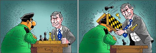 Und so findet das Match denn erst im nächsten Jahr statt, ausgerechnet bei den Arabern am Persischen Golf, im islamischen Scheichtum Bahrein. Es ist stinkend langweilig und endet 4:4 unentschieden - es bleibt dabei, daß der Mensch die Maschine im Schach nicht mehr besiegen kann. Aber wen interessiert das noch? Niemanden - oder habt Ihr von diesem denkwürdigen Nahost-Match irgend etwas in den gängigen Massenmedien gehört oder gesehen, liebe Leser? Dikigoros auch nicht; und bevor jemand nach dem fehlenden (65.) Feld "Tripoli 2004" fragt - darüber schreibt er an anderer Stelle.