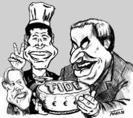 Nur am Rande - nicht auf einem extra Feld, Kaïssa bewahre! - registriert Dikigoros weitere vier Jahre später, daß Kasparow (der inzwischen seinen WM-Titel noch ein paarmal erfolgreich gegen seinen Vorgänger Karpow verteidigt hat) in New York City gegen ein "Deep Though" [tiefes Denken - dabei denken die Kisten doch gar nicht!] genanntes Schachcomputer-Programm mühelos 2:0 gewinnt und fühlt sich in seiner Auffassung bestätigt, daß der Mensch der Maschine im königlichen Spiel stets überlegen sein wird. Wenn man ihn fragte, wie es denn überhaupt so weit kommen konnte, daß ein menschlicher Weltmeister die Herausforderung so einer blöden Kiste annehme, würde er antworten: "Geld stinkt nicht" - und Kasparow kann es gerade jetzt gut brauchen; denn inzwischen sind wider einige unschöne Dinge passiert auf der Welt, die wir kurz Revue passieren lassen wollen: Die Sowjet-Union, das Bollwerk der Schachwelt, steht vor dem Kollaps; der Rüstungswettlauf gegen die USA hat sie in den wirtschaftlichen Ruin getrieben; das rote Imperium ist nicht länger zu halten. Die Berliner Mauer fällt, und bald wird nicht nur die BRD mit der DDR "wieder" vereinigt sein, sondern der ganze Ostblock - und am Ende gar die Sowjet-Union - werden auseinander brechen. Käsestaaten wie die Tschecho-Slowakei und Jugo-Slawien sowieso - mal mit, mal ohne Bürgerkrieg. Auch in Kasparows Geburtsland Aserbaidjan bricht einer aus, zwischen muslimischen Aseris und christlichen Armeniern. Aber was geht das den jüdischen Schachweltmeister an? Er ist Kosmopolit; ihm ist es egal, wo er sein Geld verdient; er zieht erst nach Moskau (seine Großfamilie - 68 Personen - läßt er im Privatjet mit ausfliegen, während der Mob in den Straßen von Bakú Jagd auf Armenier macht) und nimmt die russische Staatsbürgerschaft an, dann in die USA - mit dem US-$ steht man sich doch eh besser als mit dem russischen Rubl, der täglich weniger wert wird. Kasparow - der mal ein Anhänger von Michaïl Gorbatschëw war, der den ganzen Schlamassel einst ins Rollen gebracht hat und nun hinweg gefegt worden ist von Jeltsin, der auch nicht besser ist - nimmt die Herausforderungen des siegreichen Kapitalismus an: Warum sollen ausgerechnet die Schachspieler weiter als Staatsamateure am Hungertuch nagen, da doch alle anderen Sportarten ihre Champions zu reichen Leuten machen? Er braucht auch die korrupten alten Säcke von der F.I.D.E. nicht mehr; er gründet 1993 seinen eigenen Schachverband, die "P.C.A. [Professional Chess Association]". Die Autorität dazu kann ihm kein billig und gerecht Denkender absprechen, denn auf den 64 Feldern ist er weltweit unschlagbar - zehn Jahre lang bleibt er unbesiegt; er ist populärer als es selbst Morphy und Fischer je waren; und daß die F.I.D.E. - zum zweiten Mal nach 1975 - den amtierenden Weltmeister für absetzt erklärt und ihn wieder durch ihren willfährigen Lakaien Karpow ersetzt, wird in der Schachwelt allenfalls noch mit einem müden Lächeln zur Kenntnis genommen. [Bobby Fischer nimmt das zum Anlaß, mit seinem alten Kontrahenten Boris Spasskij nach Rest-Jugoslawien zu fliegen und dort eine Revanche für 1972 auszuspielen, als "Titelverteidigung", denn warum sollte die Aberkennung seines Titels durch die korrupten F.I.D.E.-Gangster wirksamer sein als die jetzt? Die U.S.-Regierung nimmt ihm das äußerst übel und statuiert ein Exempel ob dieses "Vaterlandsverrats" (inzwischen ist heraus gekommen, daß Fischer Jahre lang für die Kommunisten gearbeitet hat, die er doch immer zu bekämpfen vorgab) und "Verstoßes gegen UN-Sanktionen": Fischer - der das Match wieder gewinnt - wird ausgebürgert, enteignet und zur Fahndung ausgeschrieben wie ein Schwerverbrecher (bis zu 10 Jahre Gefängnis stehen auf seine ruchlose Tat); er flieht nach Ungarn, wo er sich dem Vernehmen nach bis heute versteckt hält. Nein, die Amerikaner brauchen dafür keine "Nürnberger Gesetze" gegen Juden und Halbjuden - sie sind nicht so pedantisch wie die Deutschen...]