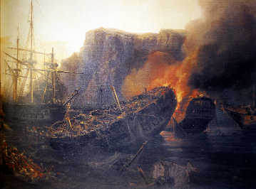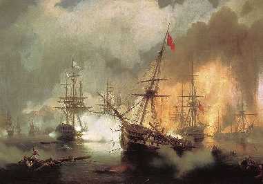 Wie war das nun mit Navarino? Die Türken bzw. Ägypter hatten auf das "Friedens"-Ultimatum der Alliierten (ja, das waren sie nun, ganz offiziell, durch den Vertrag von Sankt Peterburg von 1826) hin brav ihre Flotte zurück gezogen, eben in den Golf von Navarino. Das war für beide Seiten sicher, denn wenn die kombinierte Flotte der Engländer, Franzosen und Russen vor den beiden Eingängen zum Golf kreuzte - und das tat sie denn auch sogleich -, konnte sie verhindern, daß die Türken wieder heraus kamen; und umgekehrt konnten die Türken verhindern, daß die Alliierten herein kamen, denn die Eingänge waren mit starken Forts und schwerer Artillerie bestückt, die jedes feindliche Schiff, das den Versuch unternommen hätte, gewaltsam einzudringen, problemlos versenken konnten. (Wenn Ihr Zweifel an Dikigoros' diesbezüglichen Ausführungen hegt, dann fahrt mal hin; Ihr könnt bei der Gelegenheit auch gleich Pylos inspizieren, das eine wichtige Rolle in der Diskussion um die Lokalisierung der Odyssee des Hómäros spielt, wie Ihr hier unter dem Stichwort "Telepylos" nachlesen könnt.) Wie kam es dann trotzdem zur Schlacht? Hm... vergeßt bitte nicht, daß auf der einen Seite Briten beteiligt waren. (Die Alliierten hatten dem britischen Admiral Codrington das Oberkommendo für die gesamte Flotte übertragen.) Wie war das 1801 in Kopenhagen? Wie war das 1940 in Oran? (Nebenbei bemerkt ein Gefecht, das militärisch gesehen ebenso bedeutungslos war wie all die Seeschlachten, die Euch Dikigoros hier vorstellt: Die französischen Schlachtschiffe, die dabei versenkt wurden mochten noch so modern sein, im Zweiten Weltkrieg hatten sie grundsätzlich ausgedient; ihre Zerstörung hatte auf den Ausgang des letzteren keinerlei Auswirkungen; und auch politisch hatte sie keine Folgen, da sich Pétain entschied, die Versenkung seiner Flotte widerspruchslos hinzunehmen.) [Dikigoros verkneift sich einen nochmaligen Hinweis auf die Schlacht von Abukir, denn da war ja ganz offiziell Krieg zwischen England und Frankreich.] Seht Ihr, und so ähnlich war das auch 1827 in Navarino: Im Oktober segelte die alliierte Flotte ganz friedlich in den Golf ein und ankerte direkt gegenüber der türkisch-ägyptischen Flotte - deren Geschütze schwiegen, sowohl die oben auf den Festungen als auch die unten auf den Schiffen (die im Halbkreis, pardon im Halbmond aufgestellt waren, also ein wunderbar konzentrisches Feuer auf die Ankommenden hätten richten können). Aber warum hätten sie schießen sollen? Die Engländer und ihre Alliierten kamen doch in friedlicher Absicht! (In so friedlicher Absicht wie die Marsmenschen in Mars attacks - aber da glaubten es die Betroffenen ja auch :-) Hätte sie gewollt, hätten sie die Eindringlinge mit Mann und Maus vernichten können, bis zum letzten Schiff, und auf einen Schlag die Seeherrschaft über das östliche Mittelmeer zumindest vorübergehend zurück gewinnen können - und vielleicht sogar der Geschichte des Balkans noch einmal eine Wende geben können, die nicht zu den Balkankriegen der 1910er Jahre, zum Ersten Weltkrieg, zum Zweiten Weltkrieg und zu den Balkankriegen der 1990er Jahre geführt hätte; denn sie hatten zwar gerade (1826) die Janitscharen beseitigt und mußten deshalb mit ägyptischen Hilfstruppen kämpfen; aber diese Hilfstruppen waren hervorragend ausgebildet und ausgerüstet - übrigens von den Franzosen, die ja seit Jahrhunderten mit den Türken gegen das Reich verbündet waren und wie gesagt erst jetzt, wegen der Russen, zähneknirschend die Seiten gewechselt hatten. Aber das sind müßige Spekulationen, hätte, wenn und aber... Dikigoros will nur noch der guten Ordnung halber erwähnen, mit welcher Ausrede die Briten ihren Überfall auf die türkisch-ägyptische Flotte "rechtfertigten": Angeblich schwamm da irgendwo am Rande ein türkischer Brander; ein tapferer britischer Leutnant griff ihn höchstvorsorglich an und wurde dabei "ermordet" (merkwürdiger Ausdruck für das Erschießen eines Angreifers im - nicht erklärten - Krieg, findet Ihr nicht auch?); daraufhin eröffneten die allierten Schiffe das Feuer auf die wehrlosen, da völlig unvorbereiteten türkischen und schickten sie allesamt auf den Meeresgrund. (Von wo man sie später wieder hob und ihre Kanonen als Altmetall verkaufte - nach Bayern; viele berühmte Denkmäler in München sind daraus hergestellt :-) Und das nennen die Briten nun eine "große Seeschlacht"? Ein Abschlachten wars, weiter nichts. Kein Stoff für Heldensagen - außer auf der Leinwand einiger Maler, die nicht dabei gewesen waren.