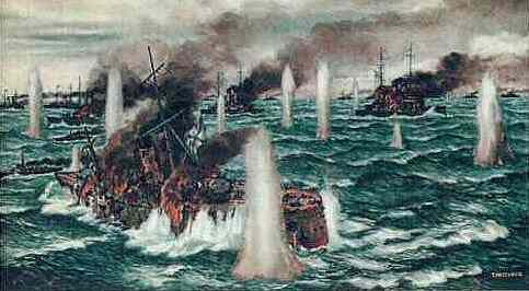 Und auf englischer Seite? Dort hatte man erst recht kein Interesse daran, die Flotte aufs Spiel zu setzen - wozu auch? Britannia beherrschte die Weltmeere und unterband den Überseehandel der Neutralen mit Deutschland; dazu brauchte es keine große Seeschlacht! Und wenn man noch so überlegen war, war das noch lange kein Grund, seine Schiffe sinnlos in einer offenen See-Schlacht zu vergeuden - wer weiß, gegen wen man sie nach der Niederringung Deutschlands noch brauchte?! Aber nun war es so, daß die Briten den Funkcode der deutschen Marine geknackt hatten, und als sie im Mai 1916 von jener Operation gegen Handelsschiffe erfuhren, beschlossen sie, die Chance beim Schopf zu packen, den Deutschen mit überlegenen Kräften den Rückweg durchs Skågerrak zu versperren und ihre Flotte auf einen Schlag zu vernichten. Unter diesen Umständen konnte es am Ausgang der Schlacht keinen Zweifel geben, denn die materielle Ausgangslage war für die Briten noch viel vorteilhafter als etwa für die Italiner 1866 bei Lissa oder für die Franzosen und Spanier 1805 bei Trafalgar: Nicht nur wußten sie aus dem abgefangenen deutschen Funkverkehr über jeden Zug ihrer Gegner im voraus bescheid, sondern die britische Flotte war überdies der deutschen quantitativ und qualitativ haushoch überlegen. (Der viel zitierte "Rüstungswettlauf zur See" war in Wahrheit eine einseitige britische Aufrüstung gewesen; auf deutscher Seite hatte in den letzten Jahren vor dem Krieg praktisch gar keine Nachrüstung mehr statt gefunden; aber das ist eine andere Geschichte.) Wie die Briten es dennoch schafften, die deutsche Flotte nicht bis zum letzten Schiff zu vernichten, ist Dikigoros ein Rätsel - es muß wohl an der Unfähigkeit ihrer Admirale Jellicoe und Beatty gelegen haben. (Die heute vielfach vertretene Theorie, daß es an der Munition gelegen habe, welche die Briten so unvorsichtig lagerten, daß sie schon beim ersten Treffer mitsamt den Schiffen in die Luft flog, teilt Dikigoros nicht; bei geschickter Kampfführung hätten die Briten die deutschen Schiffe vernichten können, noch bevor die überhaupt einen Treffer bei ihnen landeten.) Aber er will sich nicht lange mit dem Verlauf der Schlacht aufhalten; der ist - wie der fast aller anderer hier vorgestellter Seeschlachten - bestens dokumentiert und überall nachzulesen: Die Flotten stolperten in die Schlacht hinein (während die Regierungen entgegen anders lautenden Gerüchten in den Krieg nicht "gestolpert" waren, sondern entweder konsequent auf ihn hin gearbeitet hatten - so die der Entente-Mächte - oder ihn zumindest billigend in Kauf genommen hatten - so die der Mittelmächte), versenkten soundso viel gegnerische Schiffstonnage, töteten soundso viele feindliche Matrosen (wobei sich die Deutschen noch den Luxus leisteten, 177 schiffbrüchige Briten aus dem Wasser zu fischen; umgekehrt retteten die Briten keinen einzigen schiffbrüchigen Deutschen; wenn sie einen sahen, dann hielten sie vielmehr mit allem drauf, was die Geschütze her gaben) und taten dann alles, um das Gefecht schnellstmöglich zu beenden und noch höhere Verluste zu vermeiden. Kein Stoff für Heldensagen - außer auf der Leinwand einiger Maler, die nicht dabei waren.