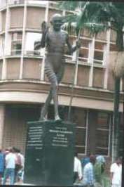 trugen sicher ein gerüttet Maß an Mitschuld -; aber Gāndhī leitete am 11. September 1906 jene verhängnisvolle Entwicklung ein; er war es, der den Stein ins Rollen brachte, der die Inder in Südafrika schließlich erschlagen sollte. Daß man ihm darob in Johannesburg und Durban - einst Inder-Hochburg, nach Joburg reichste und nach Kapstadt schönste Stadt Südafrikas, heute der nach Joburg und Kapstadt schmutzigste und gefährlichste Neger-Kraal Großstadt-Moloch Südafrikas - Denkmäler errichtet hat, wirkt rückblickend wie Hohn.