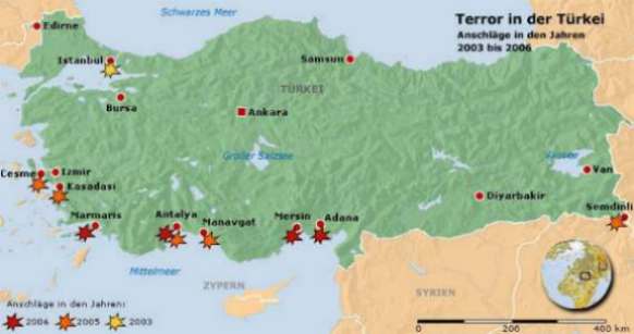 27. August 2006, Marmaris: Drei Bomben verletzen 21 Menschen, darunter zehn britische Touristen. Fast zeitgleich werden in Istanbul sechs Menschen durch eine Paketbombe verletzt. Die kurdische Splittergruppe "Freiheitsfalken Kurdistans" bekennt sich zu den Anschlägen.