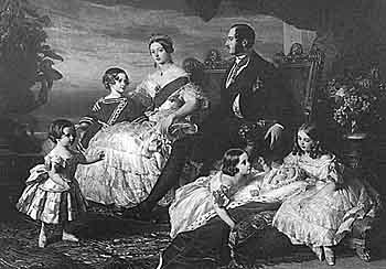 Das lag vielleicht auch daran, daß bei der Ausstellung ein nettes junges Mädchen die Honneurs machte (so wie später, im 20. Jahrhundert, die Töchter von Carter und Clinton, den Clowns auf dem US-Thron), die erst zehnjährige Princesse Royale. Wahrscheinlich begann Berti schon damals ein Verhältnis mit seiner ältesten Tochter, spätestens aber hatte er eines, als er sie mit 14 Jahren zu seiner inoffiziellen Beraterin machte. Denn nicht Königin Victoria regierte England, auch nicht ihre ständig wechselnden Parlamente, sondern Berti, der "Prinzgemahl" (der Titel war gerade erst eingeführt worden; er war ihm für seine Verdienste um die Weltausstellung verliehen worden - nicht für die als "Deckhengst"), im Bett und am Schreibtisch assistiert von seiner Tochter, die - im Gegensatz zu ihren Eltern, die nur Deutsch sprachen - fließend und fast akzentfrei Deutsch und Englisch beherrschte. Er nannte sie wie seine Frau, Vicky (Drina nannte ihre älteste Tochter dagegen haßerfüllt nur seine "Pussy" - dieses Wort begann damals die Bedeutung anzunehmen, die es heute noch hat) - und wer wollte es ihm verdenken? Vicky war ihrer Mutter wie aus dem Gesicht geschnitten (nein, liebe Leser, laßt Euch nicht durch die unterschiedlichen Frisuren täuschen!), er sah in ihr die Frau wieder, die er 15 Jahre zuvor geheiratet hatte (man sagt, daß es eine Liebesheirat war - in jener Zeit und in jenen Kreisen recht ungewöhnlich), und die auch nicht viel älter gewesen war, als er sie kennen lernte - Berti stand halt auf sehr junge Frauen. Drina reagierte verzweifelt (heute würde man "fetischistisch" sagen): Sie ging mit einem Nachthemd Bertis ins Bett, außerdem mit einer stilisierten Nachbildung seines, äh... die Biografen sagen, seiner Hand, und schob ihre Tochter nach Berlin ab, indem sie sie mit dem preußischen Kronprinzen Fritz verkuppelte.