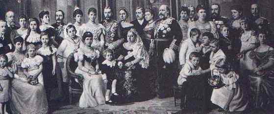 Und da er schon mal dabei ist, will Dikigoros auch noch den dritten Punkt erwähnen, in dem der Schöpfer der ersten Weltausstellung den Gang der Weltgeschichte beeinflußt hat. Er hatte nämlich nicht nur im Hinblick auf seine Tochter ein merkwürdiges Verständnis von richtiger Erziehung, sondern auch auf deren Bruder, den Prinzen von Wales, der nach seinem Vater ebenfalls Berti genannt wurde. Berti sen. versuchte, Berti jun. mit Gewalt zu einem guten englischen Thronfolger und zu einem guten Deutschen zu erziehen - ein Vorläufer dessen, was man heute "multi-kulturelle Erziehung" nennt. Das ging schon damals nicht gut. Vielmehr wurde der Junior zu einem dummen, faulen, verfetteten und versoffenen Hurenbock, der Zeit seines Lebens weder richtig Deutsch noch richtig Englisch lernte (er stotterte von klein auf). Das einzige, was er jemals lernte, war seine Eltern und mit ihnen alles Deutsche abgrundtief zu hassen. Als er endlich König von England wurde (und Kaiser von Indien - aber mit jenem Land und seiner Kultur konnte er noch viel weniger anfangen), war er bereits ein alter Mann - denn Drina wurde uralt (sie überlebte Berti sen. um sage und schreibe 40 Jahre) und weigerte sich, zu Gunsten ihres ältesten Sohnes (im Bild neben ihr stehend) vorzeitig abzudanken, da sie ihn mit Recht für einen Nichtsnutz hielt, für eine Karikatur ihres geliebten Ehemannes. Berti jun. legte als erstes den verhaßten deutschen Namen seines verhaßten deutschen Vaters ab und nannte sich Edward. (Er war der siebte Herrscher dieses Namens in England, und einige seiner Träger waren recht tüchtig gewesen; aber ob er das wußte, dumm und ungebildet wie er war, ist zweifelhaft; doch wußte er von seiner Schwester Vicky sicher, daß "Ede" in Berlin der häufigste Spitzname für Ganoven war; wahrscheinlich legte er sich den zu, um die Deutschen zu ärgern.) Dann begann er mit der Vorbereitung eines Krieges um jeden Preis gegen das Land von Wilhelm Kurzarm, seinen Neffen und Halbbruder. (Aber ob er das wußte, ist ebenfalls zweifelhaft, wahrscheinlich nicht; er mochte seine ältere Schwester - die als ein Ausbund von Tugend galt - und hätte ihr das mit dem von ihm so gehaßten Vater wohl nicht zugetraut.) Da der Preis keine Rolle spielte, wurde er entsprechend hoch: Er sollte 10 Millionen Menschen das Leben kosten, England sein Empire und Europa seine Vorherrschaft in der Welt - aber noch war es nicht so weit.