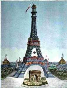 1889 ist wieder eine Weltausstellung in Paris angesagt; sie soll etwas Besonderes werden, denn es gilt den "Centenaire [100. Jahrestag]" der Revolution von 1789 zu feiern, da braucht man ordentlich Platz. Woher nehmen und nicht stehlen? Hinter der Militär-Schule am damaligen West-End der Stadt gibt es einen Exerzierplatz, der "Mars-Feld" genannt wird (nicht nach dem klebrigen Schoko-Riegel - den gibt es damals noch nicht -, sondern nach dem römischen Kriegsgott), wo Frankreich seinen Offiziers-Nachwuchs für den Revanche-Krieg gegen Preußen-Deutschland drillt. Da das etwas weit vom Schuß ist, braucht man ein weithin sichtbares Wahrzeichen, damit auch jeder hin findet. Ein junger Architekt namens Köchlin hat die nicht besonders originelle Idee, ein 300 m hohes Gerüst aus Eisenträgern zu errichten, das eigentlich gar nichts darstellt, halt einen oben spitz zulaufenden Turm mit Aussichtsplattform. "Technisch nicht machbar," lautet das einstimmige Urteil der Keksperten. Aber Köchlin sucht seinen väterlichen Freund Gustaf auf, den Ingenieur; der erkennt, daß die modernen Stahl-Legierungen viel mehr aushalten als die Eisenträger von früher; ja, er traut sich das zu, reicht einen Entwurf ein und gewinnt tatsächlich das Preisausschreiben. Vier Jahre dauern die Bauarbeiten; pünktlich zur Weltausstellung hat "Gustave Eiffel" den nach ihm benannten Turm allen Unkenrufen zum Trotz fertig.