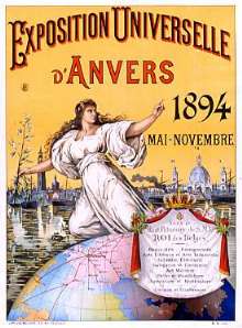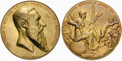 In Belgien, genauer gesagt in Brüssel, Lüttich und Antwerpen, haben schon immer große Industrie- und Gewerbe-Messen statt gefunden; und da alle Welt so etwas jetzt "Weltausstellung" nennt, tut Antwerpen das ab 1885 auch. (Die Preußen sind da bescheidener: Sie nennen ihre großen Messen, die seit 1844 regelmäßig in Berlin statt finden, einfach nur "Gewerbeausstellung"; die von 1896 ist die größte im 19. Jahrhundert, sie zieht 7,5 Millionen Besucher an - was die Veranstalter übrigens nicht hindert, Verlust zu machen, ebenso wenig wie später den Veranstalter der "Internationalen Hygiene-Ausstellung" 1911 im sächsischen Dresden, die ebenfalls mehr Aussteller und Besucher aus aller Welt anzieht als die so genannten "Welt"-Ausstellungen.) Auf den großen, dicken Denkmünzen, die Belgien zu dem Anlaß prägt, sitzt Fama, die Göttin des Ruhms, oben ohne mit einer Tröte auf einer Weltkugel, und darüber steht: "Exposition Universelle Anvers (Weltausstellung Antwerpen)"; und auf der anderen Seite steht: "Leopold II Roi des Belges Protecteur de l'Exposition (Poldi der 2., König der Belgier, Schirmherr der Ausstellung)", und seinen Kopf ziert ein langer Rauschebart. (Er ist übrigens ein Cousin von Drina, wie so viele gekrönte Häuptlinge in Europa.)