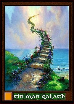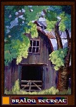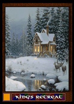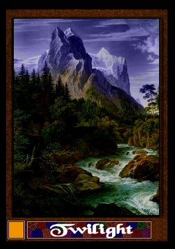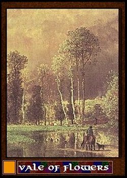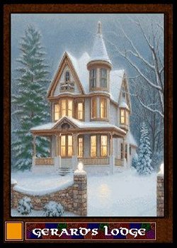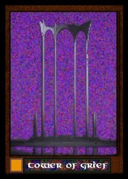 The tenth card shows a tower, a tooth of stone, rising out of a crystal clear lake. The House of Brolic rules a vast realm in the Golden Circle from this edifice. The trump delivers you at the point that this view is taken from. A way station prepares visitors for the trip down to the shore, across the ferry, and up the winding trail that leads to the top.