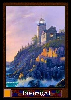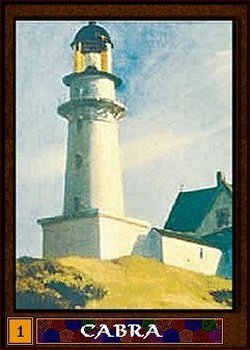 The first card is the Lighthouse of Cabra. This picturesque isle sits miles out to sea and lights the way for ships bound to Amber's shore, either down one of the many merchant-shipping lanes or randomly out of shadow. Many a ship has smashed itself against that sudden shore, hence the reason for the lighthouse. Oberon ordered it built in the early days of Amber once he discovered the isle was too big to move. Osric designed it and he, Finndo, and Benedict did much of the actual labor. The place is a dour edifice, architecturally, but consider the creators.