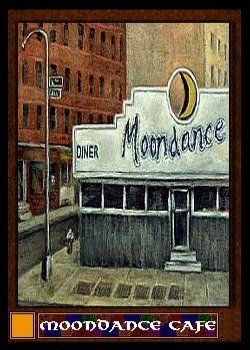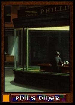 The third card is the first of the Diners of Amber and a swell place it is too. Neal's Diner is in the heartland of Antherica, a technological epoch where the sound barrier is as newly broken as the color barrier is. New Velri City, in the state of Ruthar, is a charming city that never sleeps. Likewise is the always-open Neal's Diner, a well-appointed eatery by any standard. Random included this place for two reasons.