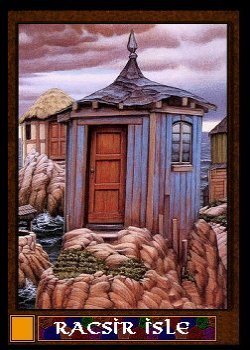 A small island in a massive world-spanning archipelago is the seventh card in the deck. I am not sure why Random included Racsir Isle but a couple things are clear. It is a great place for anglers, scuba divers, and water sportsman. Ships are common and thousands of little islands, some not much larger than one room, are connected by ramshackle walkways that make getting anywhere difficult. The people are friendly, open, and ask few questions. Nearly anyone you meet will gladly clean your fish, filet them, package them for transport or cook them up on the spot. They seem to have nothing else to do all day.