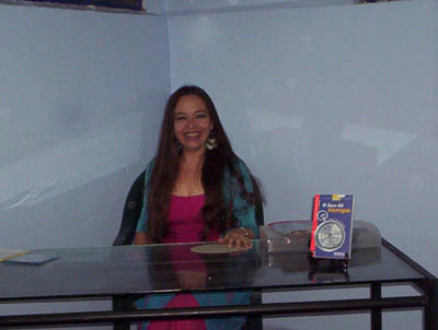 Frente a la Sala Johannes Kepler (Zempoala 244), la autora entre Álvaro Rodríguez