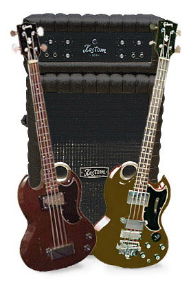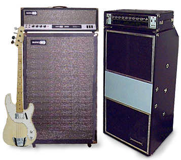 I quit rock for a short period and played in a popular music band. Downgraded back to 2-2x15 lansing Kustom cabinets. I bought the Gibson EB3 (walnut) with this rig.(Bass on right shown with Kustom amp above.)