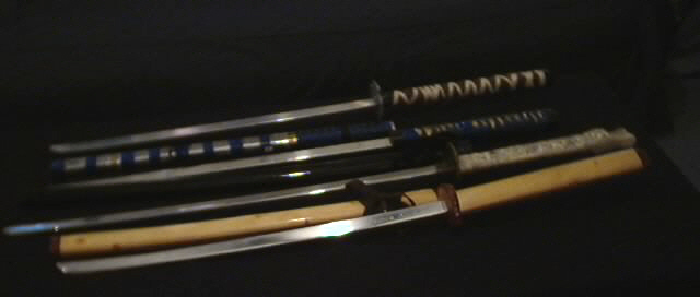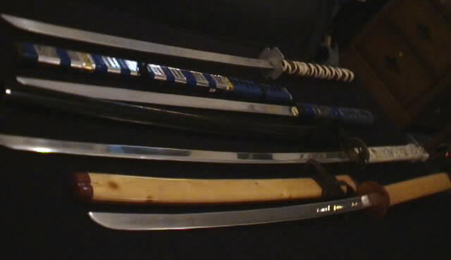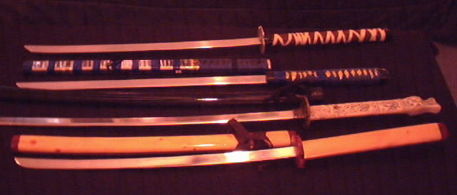| The above is a few pictures of some of my custom swords I have made. All of the swords shown above have hand ground and polished blades made of Aircraft grade aluminum. Ill try to give a little detail on each peice. The sword in the top of the picture, was the second sword I made. I was experimenting wtih different thicknesses of metal for the blade at the time, and for this sword I went a bit too thin. As you can see there is no scabbard for this sword. I didnt even finish polishing the blade because the metal was too soft and floppy, I have bent the blade many times. It did give me the opportunity to play around with a few designs such as the tsuba (guard) on the sword which i also made and gave a pebbled texture to. Also i played around with the handle wrap. The handle is made of Balsa wood, and wrapped tightly with two different colors of imitation leather. The second sword from the top is actually the first sword I ever made. I gave it a straight blade because I was still experimenting with blade thicknesses. The blade is made of 3/16" stock, strong stuff. The handle is balso wood that is covered in a gold foil and then given a twist wrap with grip tape. the scabbard is made the same way from Pine. The Only real work i did on the third sword, the dragon sword, is to make the blade. It was a Taiwan made Highlander sword, and I made a aluminum blade for it from 3/16" stock. Very high polished. The sword in the bottom of the pic, is my favorite. The hilt is completely made from wood, the tsuba is cedar and the handle is cedar and poplar. The blade is also engraved with my name on it. All of these swords are for Forms compettion. None are intended to be used to cut with and therefore are not designed that way. |