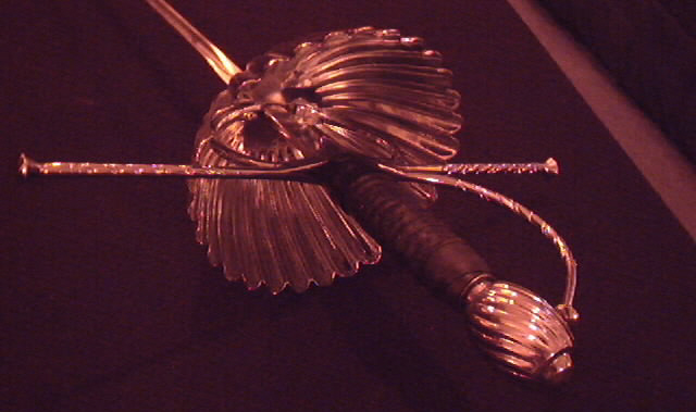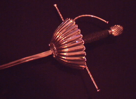 I have recently studied Rapier under fencing master Eddie Floyd and his wife Samara Floyd. A link is availble in my "links" page to the site of Swordplay Alliance. They focus alot on practical applications of the sword. Eddie is not a big fan of Sport fencing because its well, a sport. Instead of foils we use Double Wide Epees, sometimes refered to as musketeer blades. I bought a Hilt at MRL and had Eddie mount me a blade in it. The Handle that came with the hilt assembly was wire wrap and did murder to the skin, so I wrapped it in Tennis grip tape. A bit untraditional, but very comfortable. Below are pics of this sword. I hope to soon return to Eddie, for I have been away for some time due to work. |