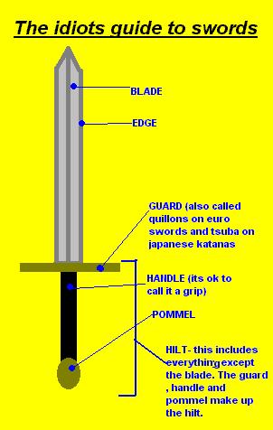 | TERMS IN NO PARTICULAR ORDER Katana- Japanese for "long sword". Common word used to desribe the nihon-to sword used by bushi (samurai) in ancient japan. This is the curved sword. Ninja-to- straight bladed sword used by ninja. shorter than a katana. Dao- Chinese curved saber. commonly called the kung fu broadsword, although i see this as being inaccurate. (see my page on this sword) Rapier-single handed sword. European in origin. commonly has a long slender blade designed for thrusting. Claymore- a real mans weapon! scottish great sword!! has distincitive downsloping guard ending in quatrafoils. Also used to describe the basket hilt variety. Tsuba- I use this word alot, its the japanese word for guard on katana. Saya- Another word youll hear me say alot. This is the japanese word for scabbard. Hamon- Japanese word for temper line (see below) Temper line- Metallurgical pattern that appears on a blade that shows the separation between different steel hardnesses. its alot more complicated then that actually. Just know this is often on japanese swords to allow the edge to be harder than the body of the sword. |