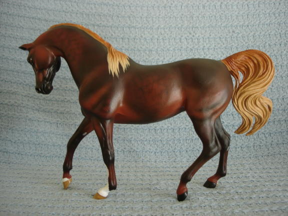 This is Kathleen Moody's beautiful, long, long sold out arab mare resin "MINUET". She is a lovely dark dappled chestnut painted by Bonnie Robb. LSQ and in perfect condition. This pieces is $350.00 (includes shipping & insurance). See another photo below.