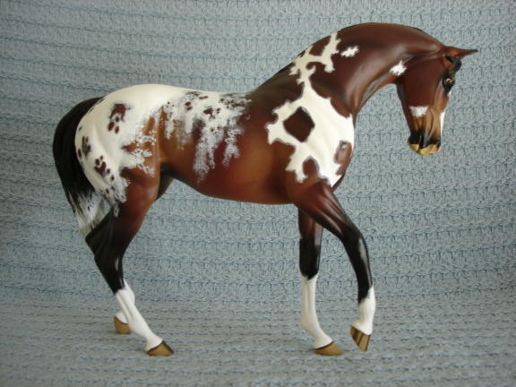 This is a Breyer "Lonesome Glory" that I customized with his head tucked and front leg lowered a little. He's in a great performance pose and is painted a flashy dark bay pintaloosa!! He's absolutley live show quality and in perfect condition. Never been shown, I just painted him. This pieces is $285.00 (includes shipping & insurance). See another photo below.