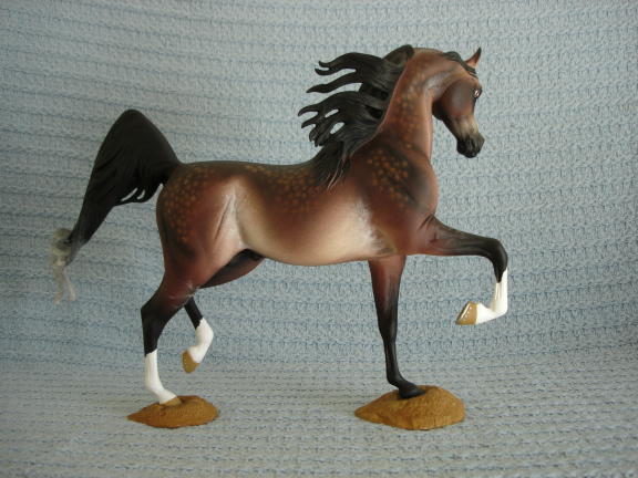 This is Debbie Lermonds beautiful, Long sold out resin "Ultimate Star". He is one of the most beautiful arab resins I've ever seen! I have painted him a gorgeous dark, dappled rose (bay going gray). He's absolutley live show quality and in perfect condition. Never been shown, I just painted him last month. This pieces is $430.00 (includes shipping & insurance). See another photo below.