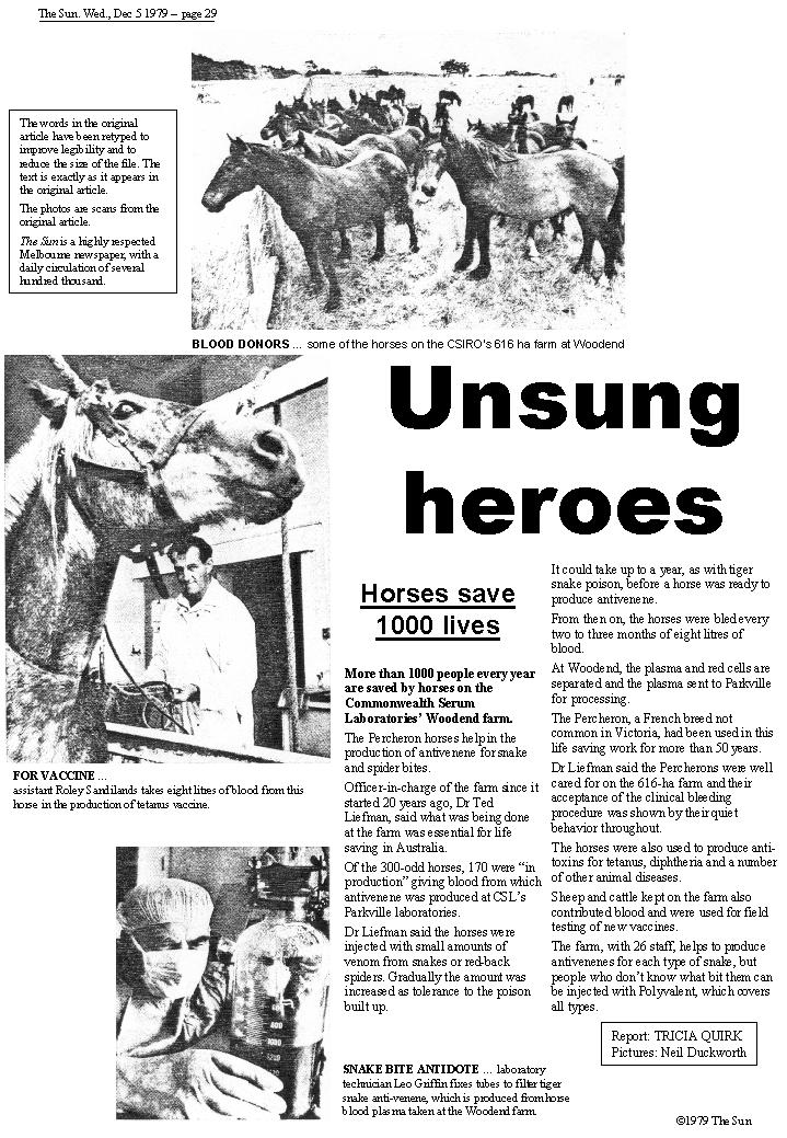 Eight litres of blood is taken from a horse every 2 or 3 months. That blood is stored and then filtered in the creation of life-saving vaccines.