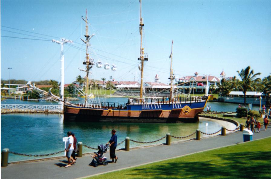 As you stand at the Entrance to Seaworld, you are greeted by a view over the entire park. One of the most prominent features you see is this impressive replica of Captain Cook's Endeavour. It was built in 1972, and was originally a restaurant. It makes a great backdrop for Seaworld's oldest dolphin pool, giving a topical feeling to the area.