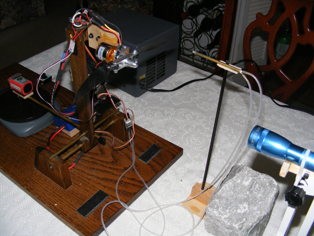 I use my Dr Kiwi Mk II pusher stand, with an Ohaus CS2000 or CS5000 Digital scale, a Zurich DS-304M 0v-15v/25A power supply, a Medusa Analyzer Plus meter, a Hobbico Digital Mini-Tach, a Raytek IR temperature gun...and currently an Esky Servo Tester (rather than the FMA Rx and Futaba 6YG Tx I used to use). When current demands exceed the Zurich's ability to supply, I use a variety of Lipo packs... Gemini 2s 4000 and 3s 4000, Enerland 2s 5400 and 3s 6000, TP Prolite 3s2p 4200, and Evo 4s 2150 packs.
