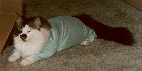 I found Maggie in a country grocery store parking lot. She was about 6 months old, had recently had kittens, and had apparently been dumped there by whoever did not want her. I was not able to find out her origins or what happened to the kittens. | She walked out from under a display table of bedding flowers outside the store, looking very depressed. I said, "What are you doing here, kitty?" and she looked me briefly in the eyes and walked under another table. I crawled down and picked her up; she put her head on my shoulder, and I was hooked. A store employee saw me holding her, and said, "Aw, isn't that nice." I replied, "Yes, it is very nice." Then he said, "That cat has been around here for about three days. You know...you could take that home with you." "I am thinking about doing just that," I replied. I put the skinny little kitty in the car with the dog, where she promptly went "HISS! HISS! HISS! HISS! HISS!" and then she seemed to realize that the dog was not going to bother her. She calmly climbed up on the dashboard and stretched out, and I drove home with her lying up there. She has been mine ever since. She now is quite a meaty kitty and weighs about 16 lbs. She got named Maggie the first time I saw her raise her tail in the air to greet me, and I said, "That's MAGNIFICENT!" Her tail is amazing...she talks with it. She caresses people with it like a big feather. We call her tail language "Plumish".