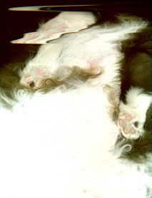 | The first time I took her to the vet, he burst out laughing and said, "This kitty has been playing in the paint can!" It's true she has a clownlike personality to go with the face...she provides us with more laughs than any cat I have ever known. She loves containers and will try to get into whatever box is open. She also thinks it is great fun to beat the living crap out of all the other felines in the household. We don't appreciate that, but she is still a GREAT and totally unique cat. As you can see by the photos. |