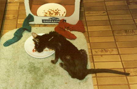 Phred was the only cat I have ever heard of who cleaned his teeth after eating. He used to chew holes in blankets and the arms off of sweaters until it dawned on me that he was using them for dental floss. After that I gave him his own socks to clean his teeth on, and he was very happy with them. He kept them by his food dish, and would eat a little food, then clean his teeth, eat a little more food, clean his teeth again...