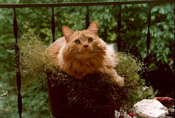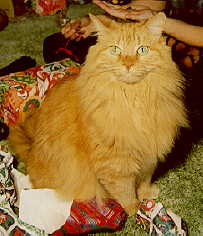 Tisha's real name is Tasha, but nobody calls her that anymore. She is called Princess, Tisher, Tishhead, Tish, and Puff. Most commonly she is addressed as "Nice, NICE Orange Kitty." Tish came to live with us as a kitten. My daughter, who convinced me to let a copiously shedding, long-haired, flea-infested, farting kitten join our household, thinks this is still "her" cat. *HA HA HA HA HA* This is now MY cat. Tish is the softest, sweetest, most cuddly cat in the entire universe. Tish is a big adorable teddy bear cat. She likes people to take naps so she can lie on their chest and put her paws on their lips and purr. Considering where her feet have been, I should find this disgusting, but it actually is quite endearing. Strangely enough, at night she sleeps quietly at the foot of the bed. Her worst habit is waking people up at 3 or 4 a.m. either to have you open the door to Melody's room (the bathroom) or just because she would like you to be up. She either claws at the door, or she finds something that makes noise, like a bag or a piece of paper in the trash, and rips it to pieces until you get up to strangle her. For some reason, Tish has an affinity for prom dresses. She just loves to suck on nice polyester prom dresses, tulle, georgette, you name it. I do not understand this at all, but with a cat that adorable you can forgive a lot. We just call her the Demon Prom-dress Sucking Cat from Hell and try to keep the closet doors closed. Otherwise, you are apt to find her sitting at an open door with her mouth full of skirt, sucking blissfully with a meditative look on her face.... Tish sheds so much that is amazing she is not bald. In the winter she grows a lovely mane, which she sheds in big clumps in the spring. When I had to get new carpet for the house, I took a bag full of Tish hair with me. Once I had narrowed down my choices, the final decision was made by emptying the fur wads onto the carpet samples. The one that hid the hairballs the best is the one we got.