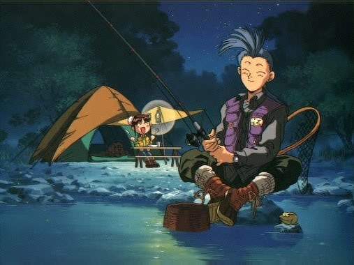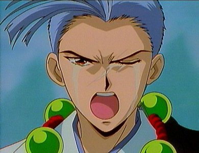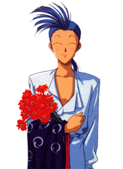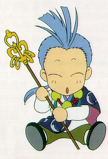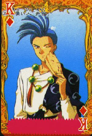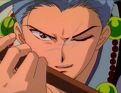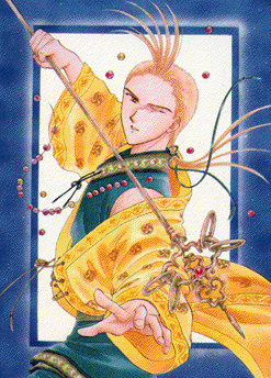 This very nice looking person here is Chichiri, a wandering monk who is also Miaka's seishi. He is the only one who hides his face in a mask, because he has a scar across his left eye. Depending on whether he's wearing his mask or not, Chichiri can be either silly or serious. He provides a lot of comedy throughout the series, like appearing in SD form and always ending his speech with a cute "no da". However, as the oldest seishi, he acts as the leader of the group and helps the other seishi with his magical powers.