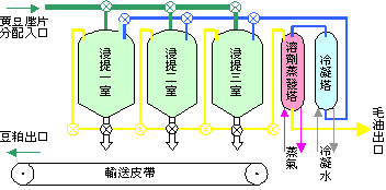 豆粕 → 高溫或低溫法去除殘留溶劑 → 飼料豆粕、釀造豆粕。亦可考慮使用超臨界流體技術。