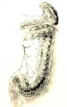 TRATAMIENTO 13 Esta imagen ilustra la extensi�n de la resecci�n y la ligadura de las arterias ileoc�lica y arterias c�licas derecha,media e izquierda. |