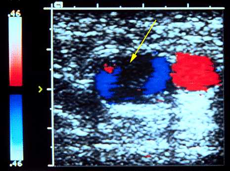 Color-flow-Doppler-ultrasound is a highly sensitive and specific test for deep-vein thrombosis. It combines the ability to detect changes in venous flow and venous collapse under the ultrasound probe pressure using color Doppler visual display. This image shows a non-compressible filling defect in the vein, consistent with deep-vein thrombosis (arrow).