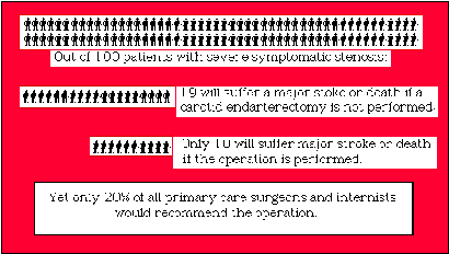El 19% de pacientes con una estenosis carotídea sufrirá un accidente cerebro-vascular agudo o morirá si no se le realiza una endarteriectomia.Solo el 10% de los enfermos operados fallecen o sufren un ictus Sin embargo por falta de información del notable beneficio de la endarteriectomia carotídea solo un 20% de Médicos recomiendan esta intervención quirúrgica a sus pacientes. Goldstein et al. US national survey of physixian practices for the secondary and terciary prevention of ischemic stroke Stroke 1995, 26(9):1607-1615 |