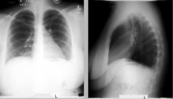 La sala ventila el gas arterial de sangre mostró pH 7.41, PCO2 35 y PO2 91. El EKG era normal, y la radiografía de pecho ningún mostró infiltra pero embotando al izquierda costophrenic ángulo.