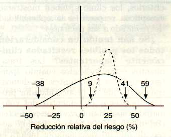 dijimos que cuando el intervalo de confianza del RRR es negativo y dicho intervalo es muy amplio se deberia aumentar el tamaño de la muestra.Por ejemplo: Analizamos en 100 pacientes el RRR de un medicamento que disminuye el número de muertes en un 25%, con un IC de -38% a 59%.Ello quiere decir que según el límite inferior del IC (-38%) dicho medicamento NO tendria ningún beneficio sino que incluso seria nocivo porque la probabilidad de fallecer de los pacientes del grupo experimental (que toman ese medicamento) seria un 38% MAYOR que los del grupo control (placebo). Al mismo tiempo tomando el límite superior del IC resultaria que efectivamente el medicamento seria útil porque los pacientes del grupo experimental tendrian una probabilidad de fallecer de un 59% MENOR que los del grupo control. Es decir estamos ante un IC demasiado amplio con su límite inferior negativo. Figura1.