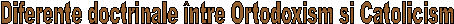 Credinta si ratiuneBiserica ortodoxa foloseste stiinta si filozofia pentru a apara si a explica credinta. Ea nu incearca sa reconcilieze stiinta cu credinta, ci atunci când exista suport stiintific pentru invataturile ortodoxe, le accepta. In niciun caz nu schimba articolele de credinta pentru a fi in concordanta cu stiinta zilei. Biserica romano-catolica, isi bazeaza doctrina pe cunostintele stiintifice ale momentului respectiv. Aceasta tendinta a devenit evidenta inca din secolul 13, când Thomas de Aquino a unit credinta cu filozofia lui Aristotel. Intrucât stiinta evolueaza, iar ceea ce era valabil in secolul 13, este inacceptabil pentru stiinta secolului 17, face ca doctrina romano-catolica sa fie intr-o continua schimbare si ii confera un pronuntat caracter de instabilitate. Ortodoxismul pastreaza nealterata credinta, asa cum a fost primita de apostoli de la Isus, întrucât autoritatea evangheliilor si invataturile Sf.Parinti nu au fost niciodata contestate de catre biserica ortodoxa. Biserica romano-catolica a emis teoria dezvoltarii doctrinale, pentru a-si justifica desele schimbari doctrinale. Teologii catolici sustin ca Isus a dat doar samânta crestinismului, iar biserica a dezvoltat-o mai departe, adaptându-o la conditiile concrete. Aceasta libertate a dus de multe ori la devieri tragice (inchizitie, indulgente, vânatoarea de vrajitoare etc). In urma cu câteva decenii, la Conciliul Vatican II, catolicismul si-a revizuit din nou doctrina, ceea ce a facut ca diferentele dintre cele doua biserici sa se adânceasca si mai mult, iar totodata a creat o puternica opozitie in sânul catolicismului, aripa conservatoare acuzând in repetate randuri papalitatea si aripa liberala de a actiona in interese straine crestinismului.