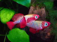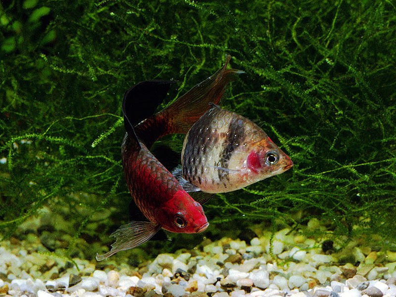 These beautiful fish are cross of B. nigrofasciatus and B. conchonius. Note the eggs under the males mouth.
