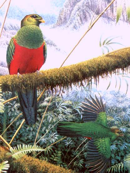 | Las mariposas se arremolinan en torno a las flores. | Camuflada entre la vegetación del estrato medio una boa esmeralda espera a su próxima presa. | Tunqui o gallito de las rocas peruano (Ripicola peruviana). Considerado como ave nacional del Perú por su espectacular colorido. |