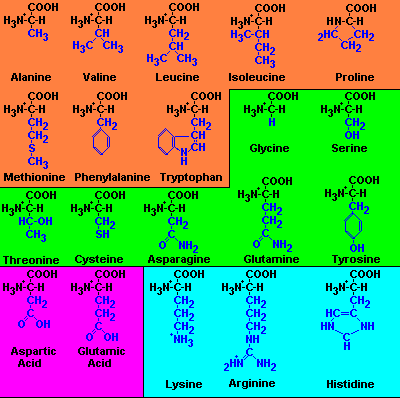 carboxilo" (COOH) (en negro en el diagrama). Los aminoácidos varian